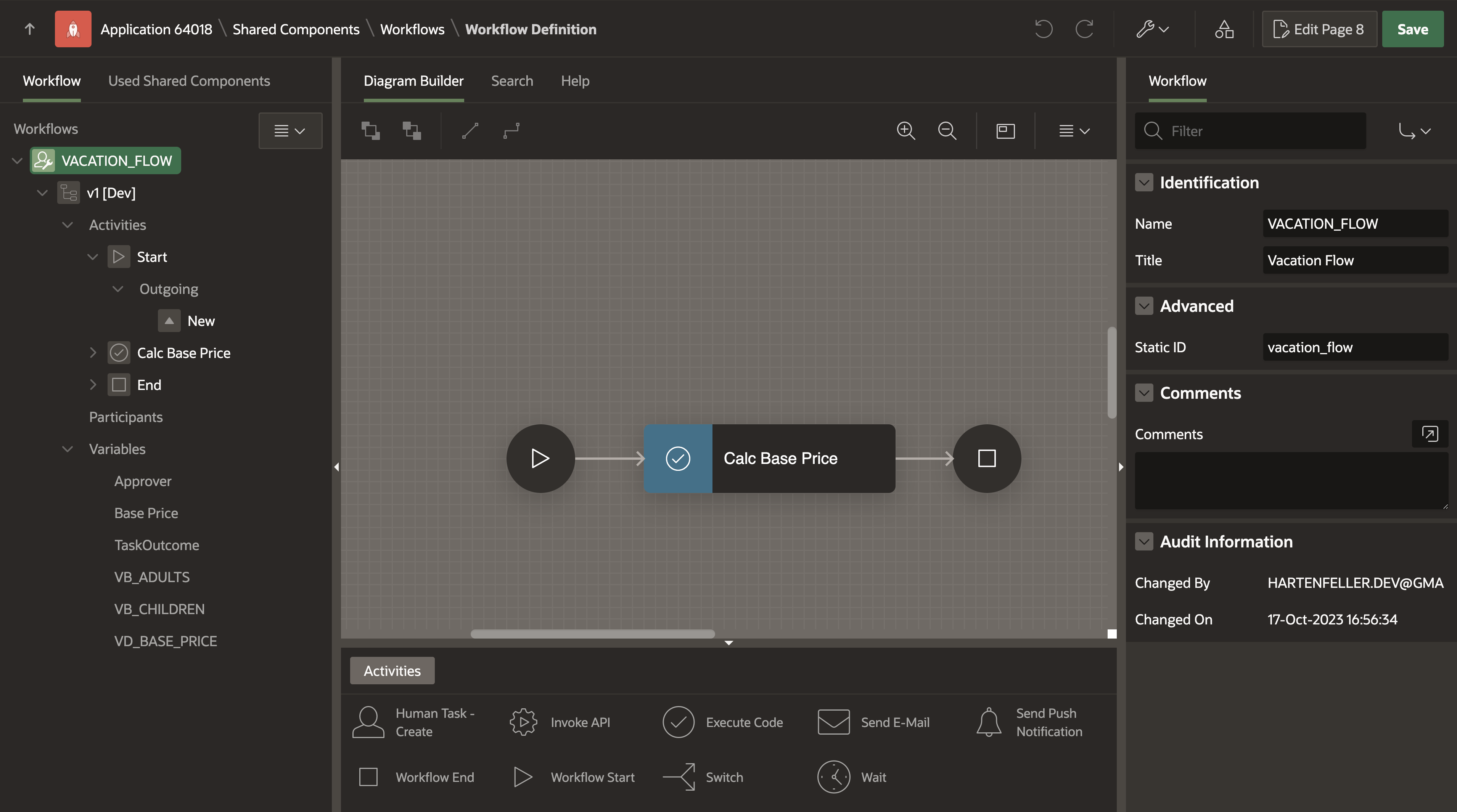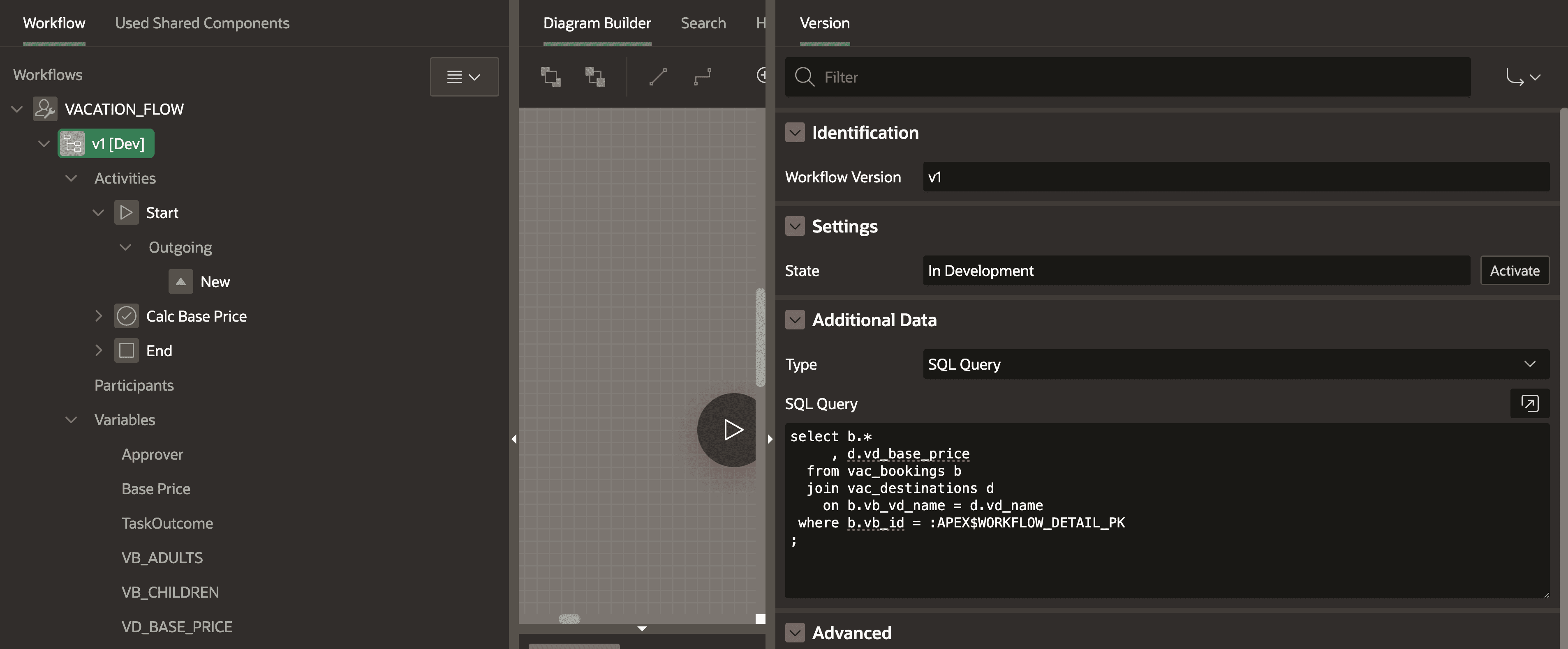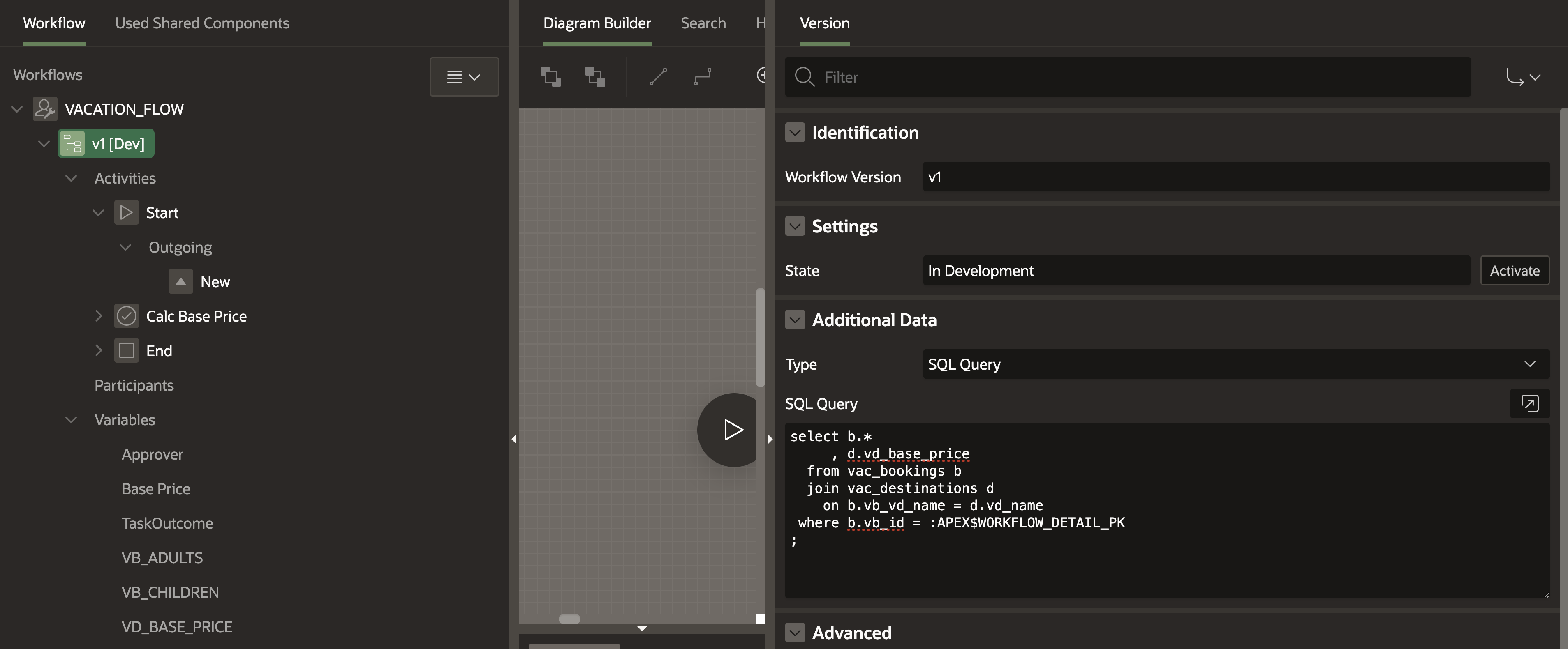 I renamed my version to v1. Additionally, we can “activate” it to move to production mode. I guess it works the same as Flows for APEX, where it prevents you from modifying the flow in production mode, whereas this is possible in development mode. I also entered a query into “Additional Data”. This allows us to access the returned data in our workflow. We use the substitution string APEX$WORKFLOW_DETAIL_PK which will represent the primary key value of the workflow instance. We will later see how we can use this.
