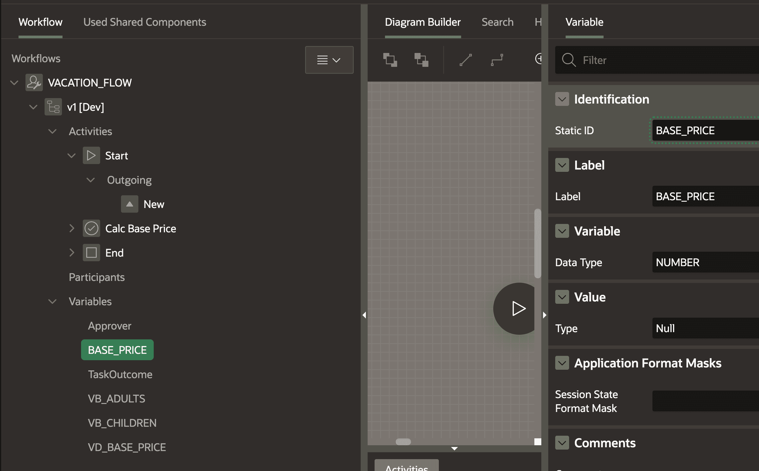 To calculate the price of a vacation, we need the base price of the destination table and the number of adults and children. As I already queried all these values in the “Additional Data” section, I can just create variables with the same column names. Additionally, I want to store the result in a variable called BASE_PRICE. We set all the data types to “Number”.