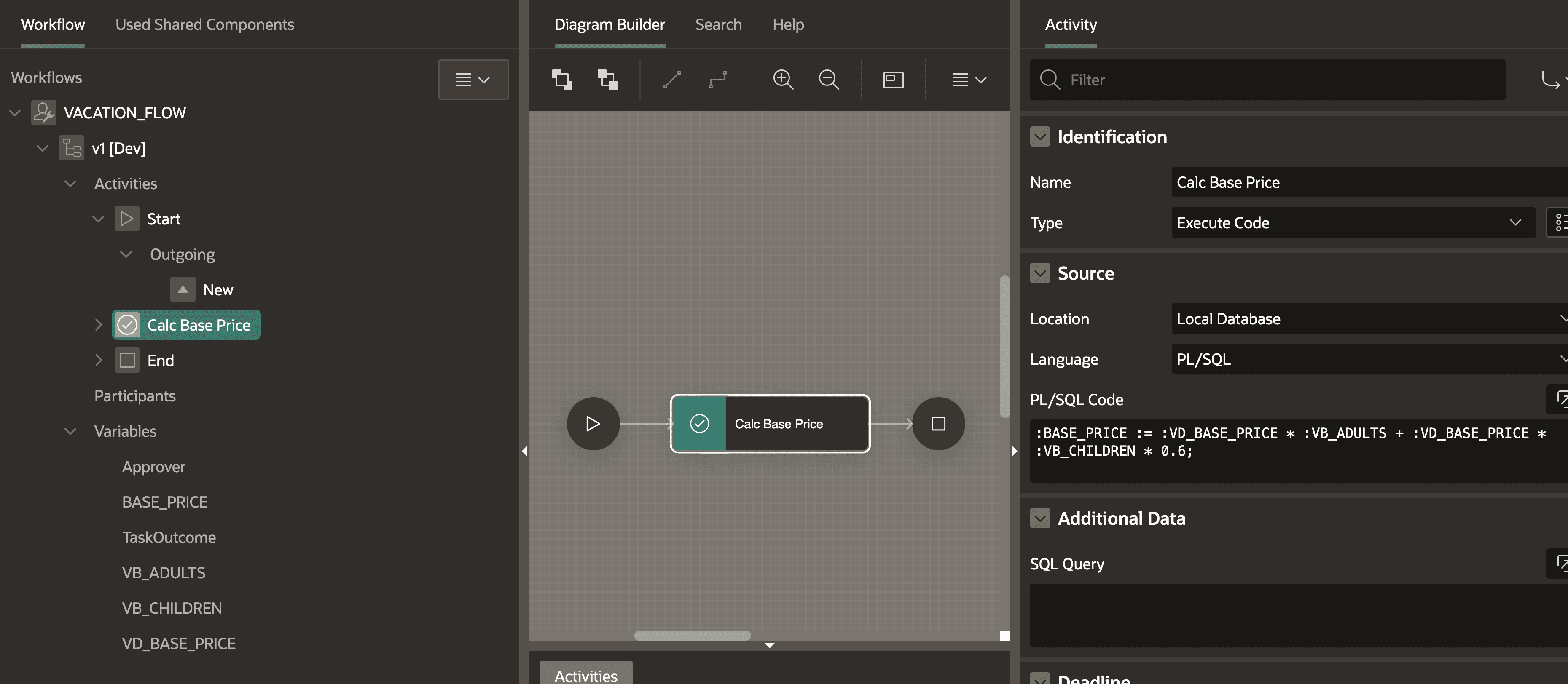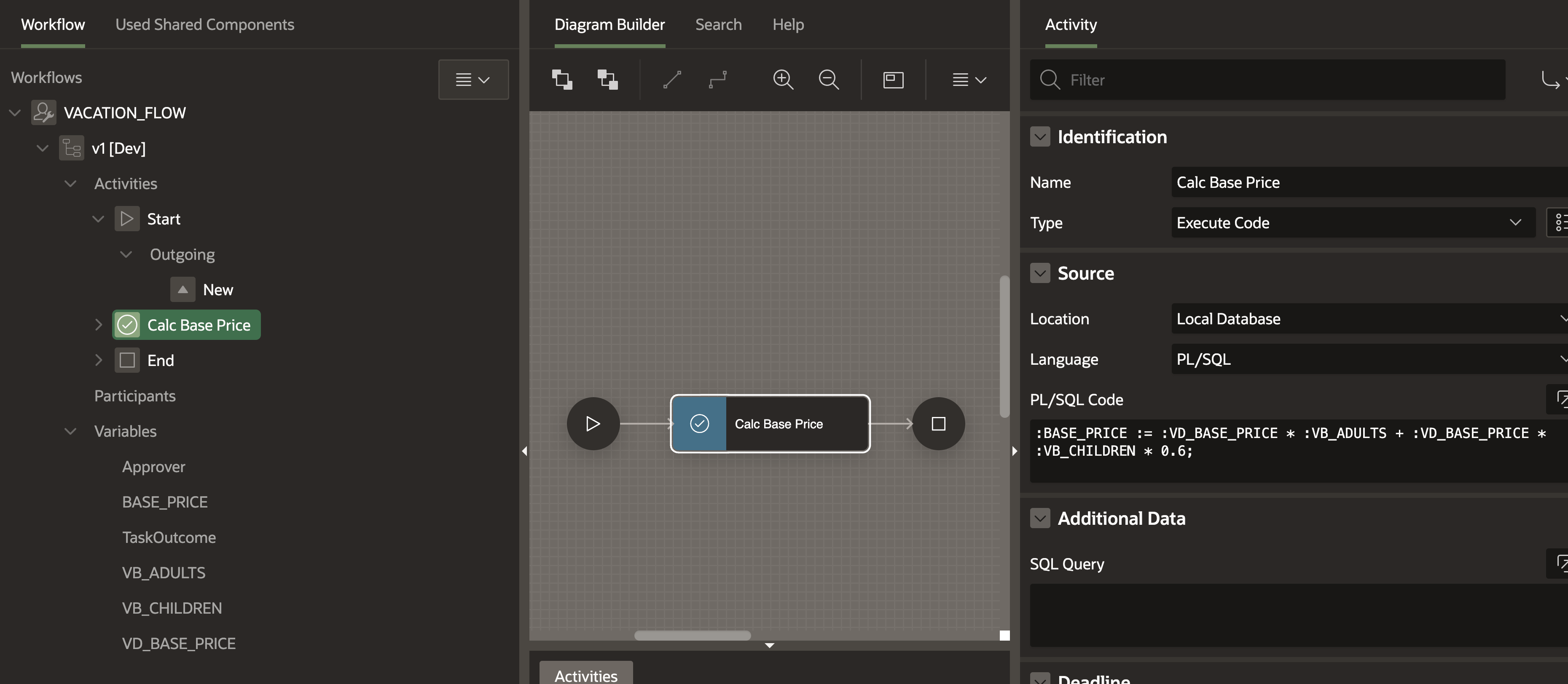 #There should already be an activity between the start and end nodes. We can modify it to do the calculation. I renamed it to “Calc Base Price” and made sure the type is set to “Execute Code”. We can then pass the computation code. In our case, children pay 60% of the base price and adults pay 100%: