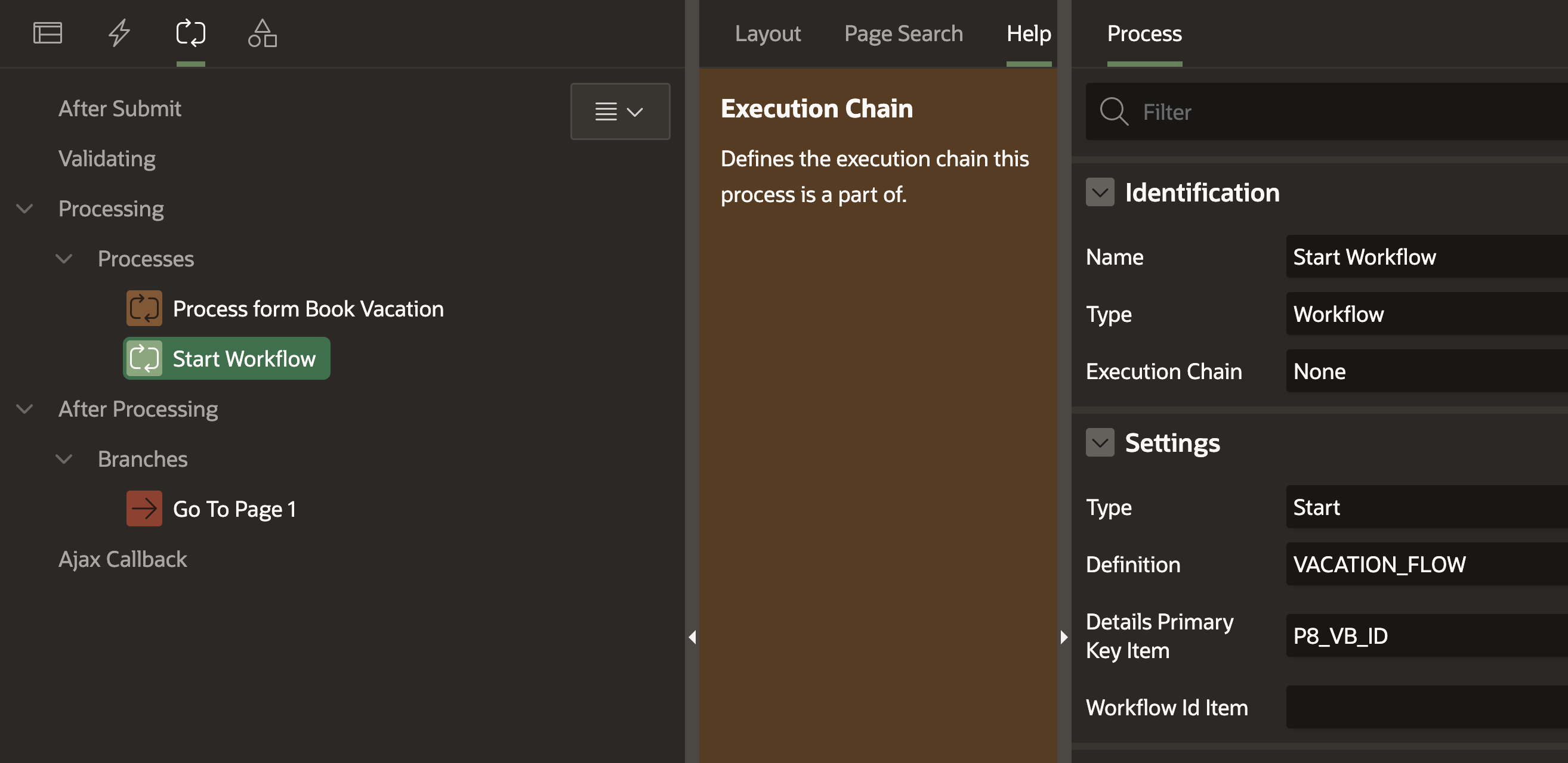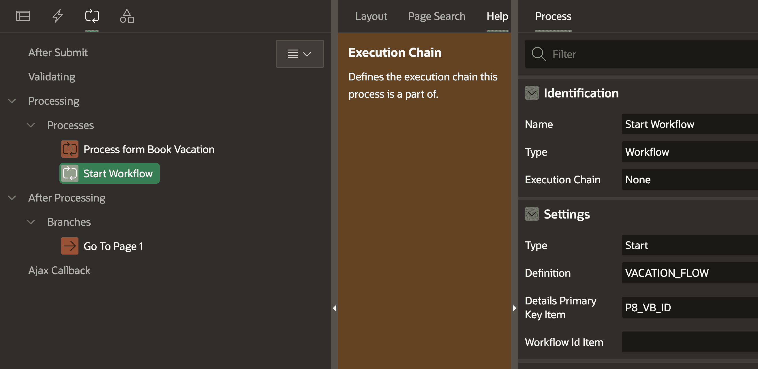 #When we head back to our form page that creates a new booking, we can add a new process after the form process. The type of the new process is “Workflow” and we can then choose our created workflow. Additionally, we pass the primary key page item in “Details Primary Key Item”.