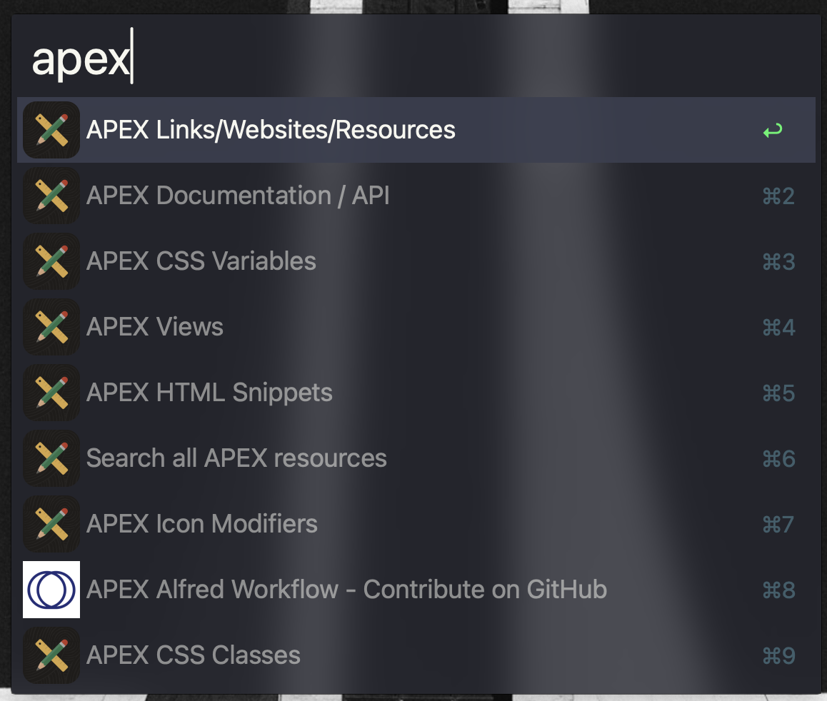 #Type apex in your Alfred search bar, and you will get a list of categories related to Oracle APEX: