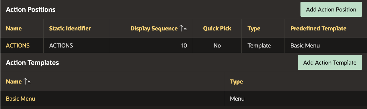 You can first start by creating an Action Template. You can give a name and then choose between the types Menu and Button. I chose Menu and changed the default template to make it look like a default APEX button: