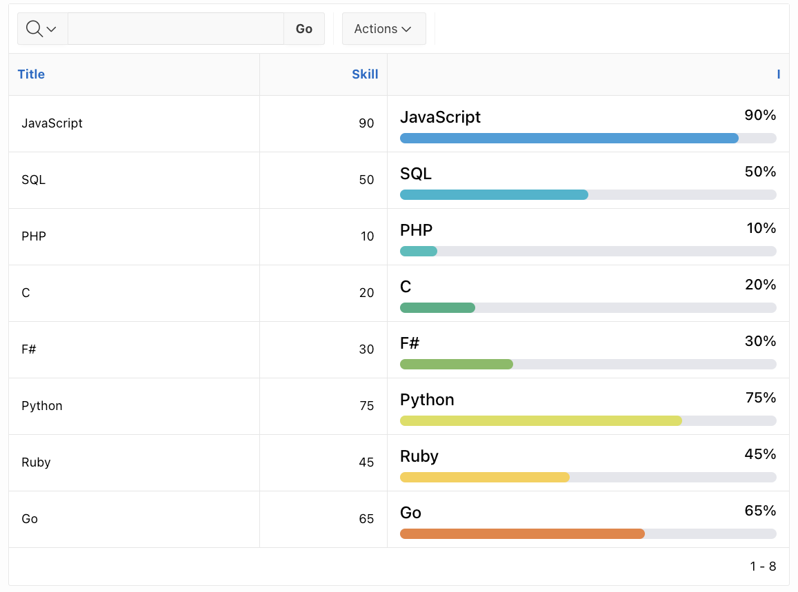 #As we checked both boxes in the display as section of the Plug-In, we can also use the template component as an Interactive Report column. I created a new Interactive Report and entered the same query. I then changed the last column that contains the index to the type of my Progress Bars Plug-In. Likewise, I had to assign the columns to the placeholders.