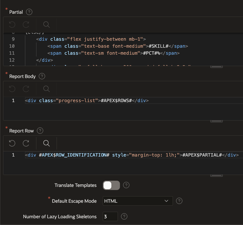 Next up, you can define the Partial template. This is the template that will be used to render a single instance of the component. A default template should be visible that starts with an if condition: {if APEX$IS_LAZY_LOADING/}. You can ignore this part for now, as we will come back to it later, but this indicates that we can use template directives. They are a mighty tool that I won’t go into detail here, but you can check out the documentation on it (currently there is no 23.1 API yet).