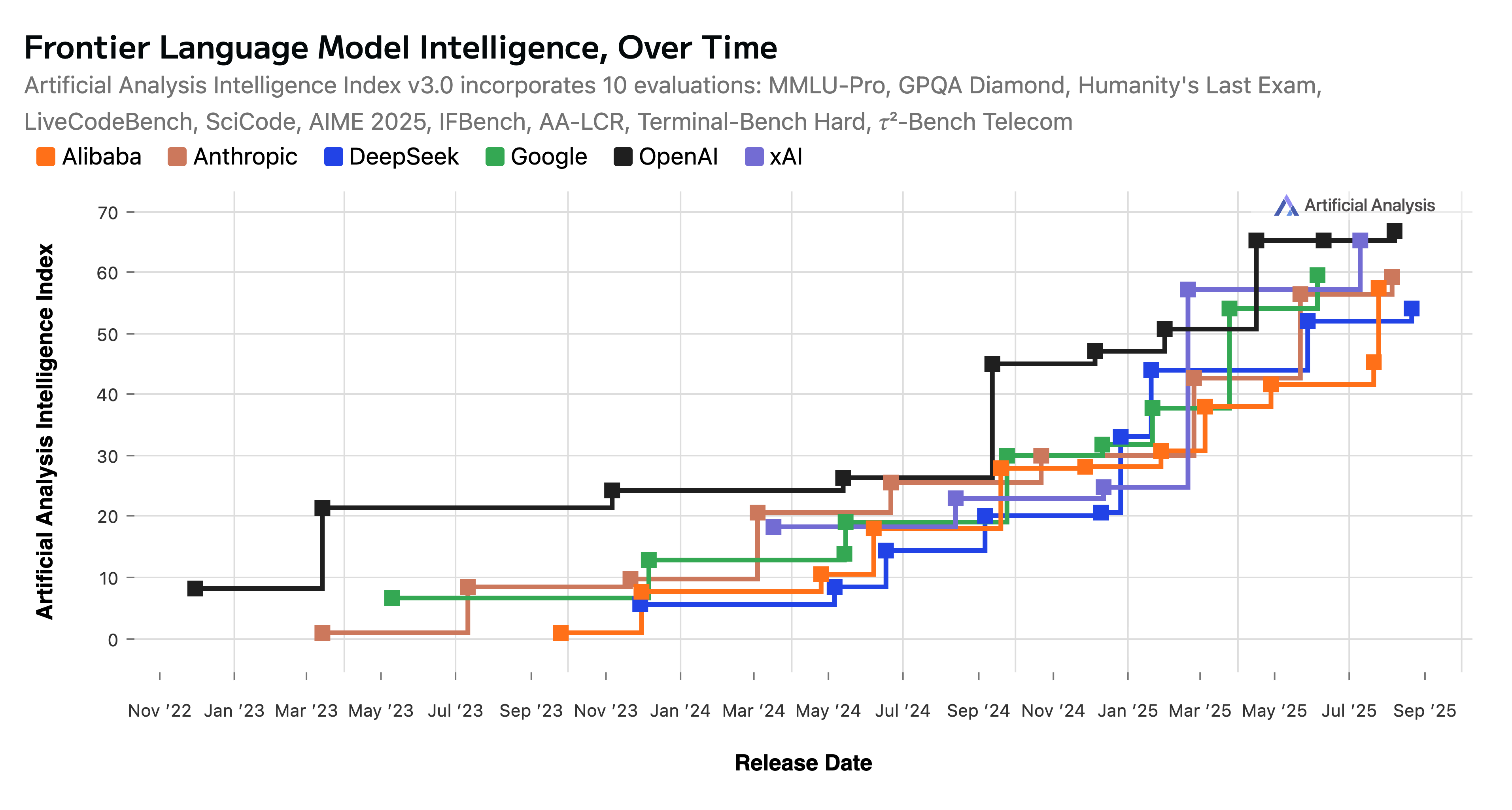 Also, platforms like Artificial Analysis provide great benchmarks to compare models. This picture shows one of their benchmarks over time, making it a good chart to show AI progress and competition over time. OpenRouter shares rankings on which models are mostly used and also in which industry.