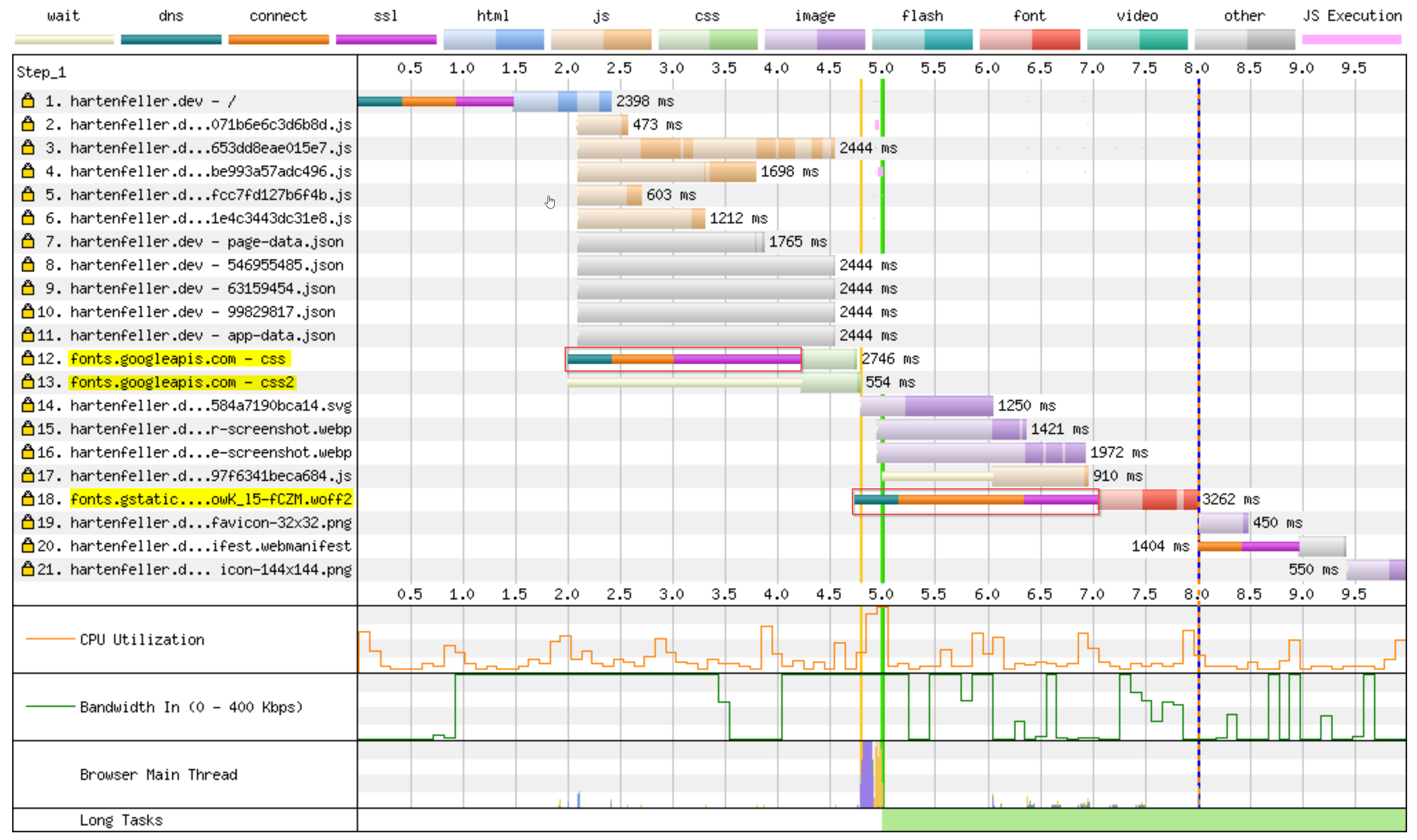In rows 12, 13, and 18 these fonts cause two connections to different servers. The interesting part is the one I highlighted in red borders. This is exactly the cost of an additional HTTPS connection consisting of a DNS lookup, the connection itself, and establishing an SSL encrypted connection.