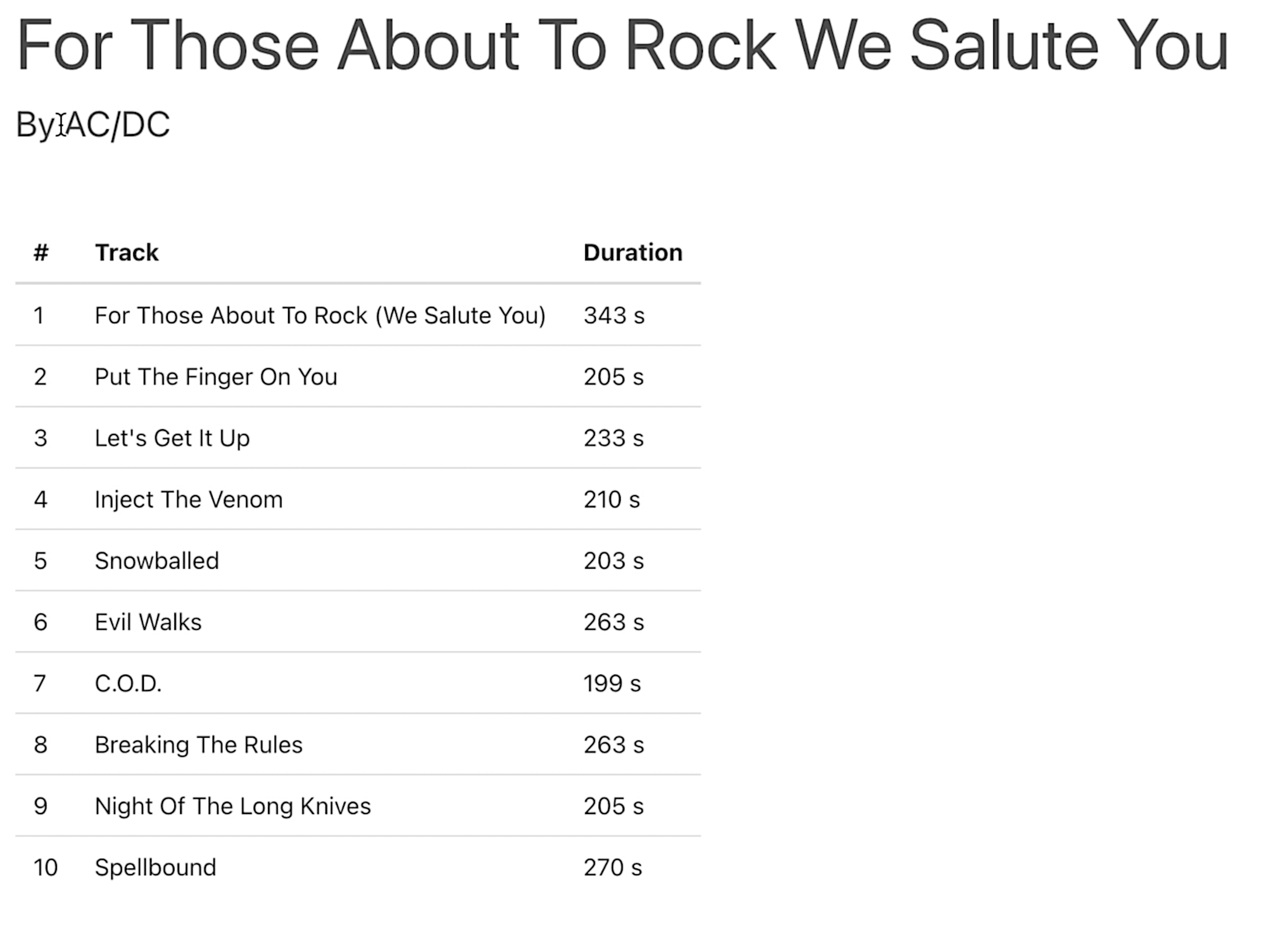 #The example database has a table called tracks. We will query this table to display the first 50 tracks on our home page.
